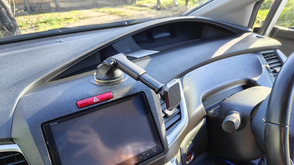 Штанга держателя имеет телескопическую конструкцию. Длина выдвижной секции - 50 мм, общая длина штанги - примерно 120 мм. Угол наклона ее можно менять в широких пределах, фиксируя после настройки зажимным винтом в основании. Штангу можно развернуть на 180 гр., это может понадобиться для выбора нужного угла наклона. При установке на лобовое стекло и торпедо углы сильно отличаются и иногда требуется развернуть штангу для достижения нужного значения угла наклона.
