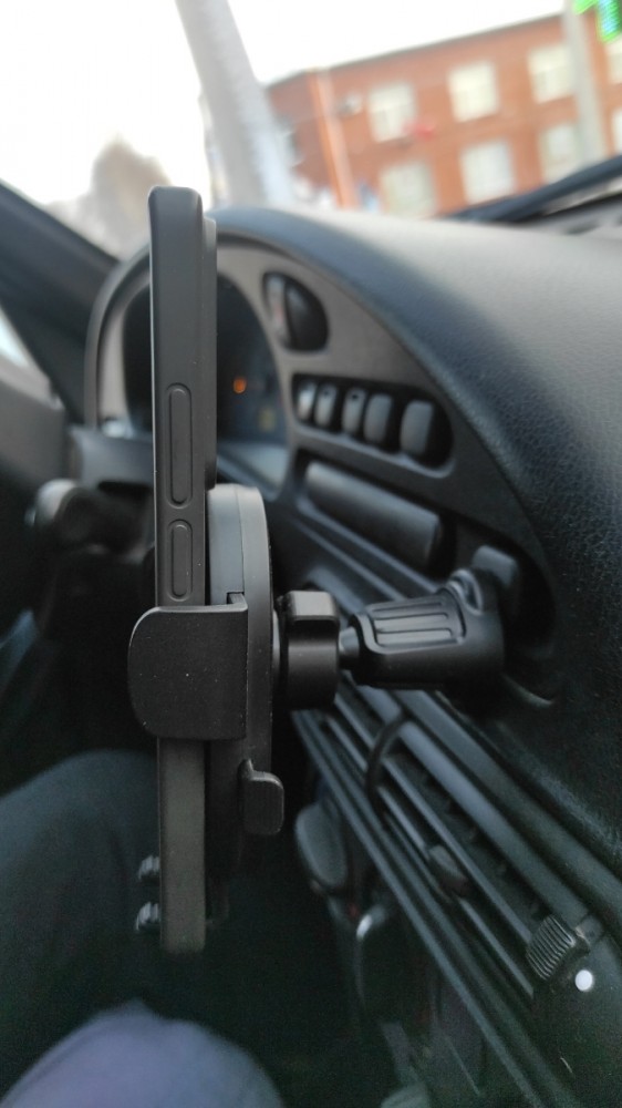 Захват происходит автоматически при касании тыльной стороной смартфона овальной клавиши на держателе. Нижняя полка полностью исключает выпадание смартфона, а вырез на ней открывает доступ к зарядному порту